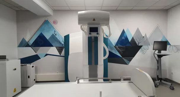 Au-delà de l’aspect technique, l’ambiance des salles a totalement été repensée. « Nous avons fait appel à une coloriste pour apporter une touche d’originalité et un cadre agréable pour les patients. Ainsi, la salle de radiographie dégage un esprit plutôt scandinave avec des couleurs douces et des formes triangulaires qui créent un paysage », décrit Benoit Cauwet. La salle de mammographie, quant à elle, arbore des nuances de rose et se pare d’un cerisier japonais. « Ce cerisier, au-delà d’être très esthétique, a également comme fonction de capter l’attention des patientes durant les examens anxiogènes », ajoute Benoit Cauwet.