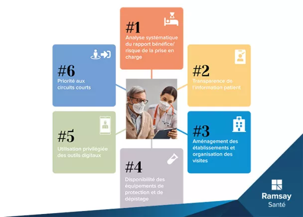 Grâce à l’engagement sans faille des médecins et des personnels soignants, Ramsay Santé a réorganisé ainsi ses activités médicales et chirurgicales de façon à sécuriser les patients, physiquement et psychologiquement, dans le contexte de l’épidémie Covid-19.  Cette réorganisation prend la forme d’"engagements patients", qui s’appliquent à l’ensemble des 133 établissements Ramsay Santé en France.