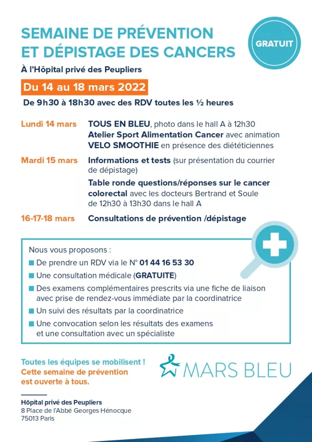La campagne Mars bleu veut promouvoir l'importance du diagnostic et du traitement précoce du cancer colorectal qui touche, selon l’Institut national du cancer, plus de 43 000 personnes chaque année en France. L’Hôpital Privé des Peupliers (Ramsay Santé), situé à Paris, organise des consultations médicales de prévention et des dépistages (gratuits) à l’occasion de ce mois de sensibilisation. Détails avec Catherine Desmeules, chef de projet à l’Institut de cancérologie des Peupliers.