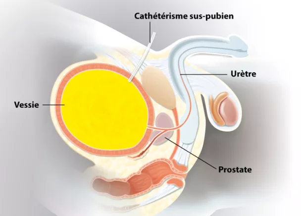 Le cathétérisme sus-pubien consiste à mettre en place un drain dans la vessie à travers la peau de l’abdomen, pour permettre à l’urine de s’évacuer vers l’extérieur. Il assure la vidange de la vessie quand un obstacle ou un blocage ne permet plus à l’urine de sortir par les voies naturelles. Ce dispositif permet d’attendre que la cause du blocage soit traitée. Il peut ainsi rester en place plusieurs semaines.