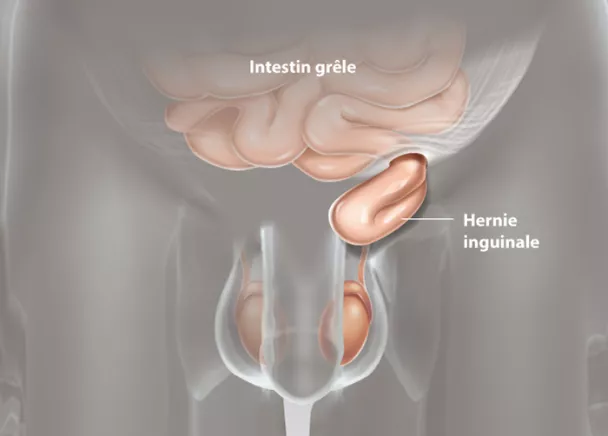 À certains endroits de la paroi, là où les muscles sont plus fins, là où cheminent les vaisseaux, il existe des zones de faiblesse, trois principalement. Le péritoine peut à ces endroits faire hernie, c’est-à-dire passer entre les fibres musculaires et entraîner avec lui un petit bout d’intestin. C’est le cas des hernies de l’aine, appelées « hernies inguinales ». Ces hernies sortent en général par le canal qui, chez l’homme, constitue le passage vers le bas-ventre du cordon spermatique qui vient du testicule.
