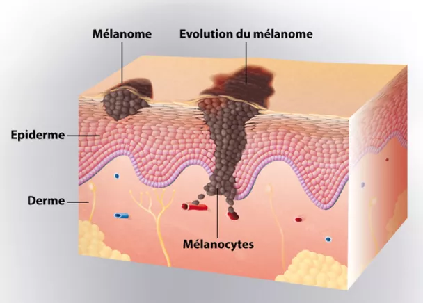 Le mélanome est une tumeur maligne qui se développe à partir de cellules de la peau appelées mélanocytes. Ces cellules sont situées dans l’épiderme (couche supérieure de la peau) et produisent la mélanine. Le mélanome se développe d’abord à la surface de la peau, grossit et devient plus profond, atteint le derme (couche intermédiaire de la peau), puis peut disséminer et envahir d’autres parties du corps.