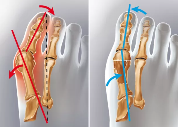 Le chirurgien va sectionner l’os métatarsien porteur du gros orteil (ostéotomie) ainsi que celui situé à sa base afin de les remettre dans le bon axe ; il finira en rééquilibrant les « parties molles » (tendons, ligaments et enveloppes articulaires) qui se sont généralement rétractées au fil des ans. Dans certains cas, les os réalignés sont simplement maintenus en place par un pansement solide, mis en place par le chirurgien. Parfois, le chirurgien pose deux petites vis pour fixer les os sectionnés. Cette pose permet de marcher d’emblée en posant tout le pied sur le sol, au besoin en portant des chaussures spéciales où l’on n’appuie que sur le talon. Ce qui accélère la cicatrisation et, surtout, diminue les complications : le sang circule mieux, il n’y a pas de déminéralisation osseuse, pas de phlébite, ni d’algodystrophie (complication douloureuse qui touche entre 5 et 10 % sinon). À noter que ces vis, en titane, n’interdisent pas de faire des IRM (voir fiche) et ne font pas sonner les portiques d’aéroport.