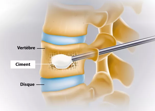 La vertébroplastie est une technique interventionnelle qui consiste à injecter dans une vertèbre une résine qui se transforme en ciment, pour la consolider.
