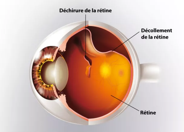Le décollement de rétine, qui se manifeste par des éclairs lumineux, un voile, voire une baisse de la vision, impose de contacter d’urgence un ophtalmologiste.