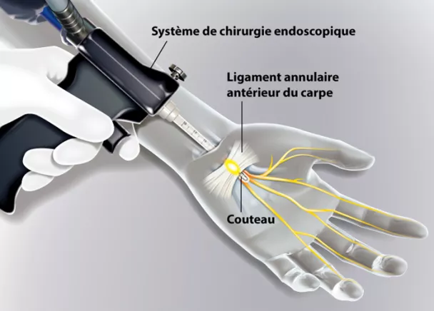 La technique endoscopique a l’avantage d’éviter la cicatrice dans la paume de la main et de permettre une reprise d’activité plus rapide. Elle n’est pas réalisable dans tous les cas, en particulier quand le poignet est raide, de très petite taille, lorsqu’il existe un antécédent de fracture avec un cal vicieux ou en cas de synovite importante.