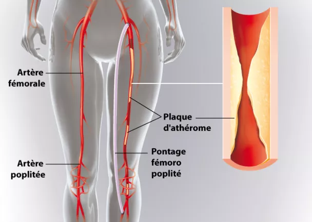 Imaginez une autoroute bloquée par un important rétrécissement de la chaussée (on passe de quatre voies à une seule). Pour contourner le rétrécissement, on fait un itinéraire de délestage, permettant de quitter l’autoroute avant le rétrécissement et de la rejoindre après le bouchon.Pour l’artérite des jambes, le problème est le même : un rétrécissement empêche le sang artériel d’arriver dans la jambe. Le chirurgien va donc créer une dérivation, appelée pontage.